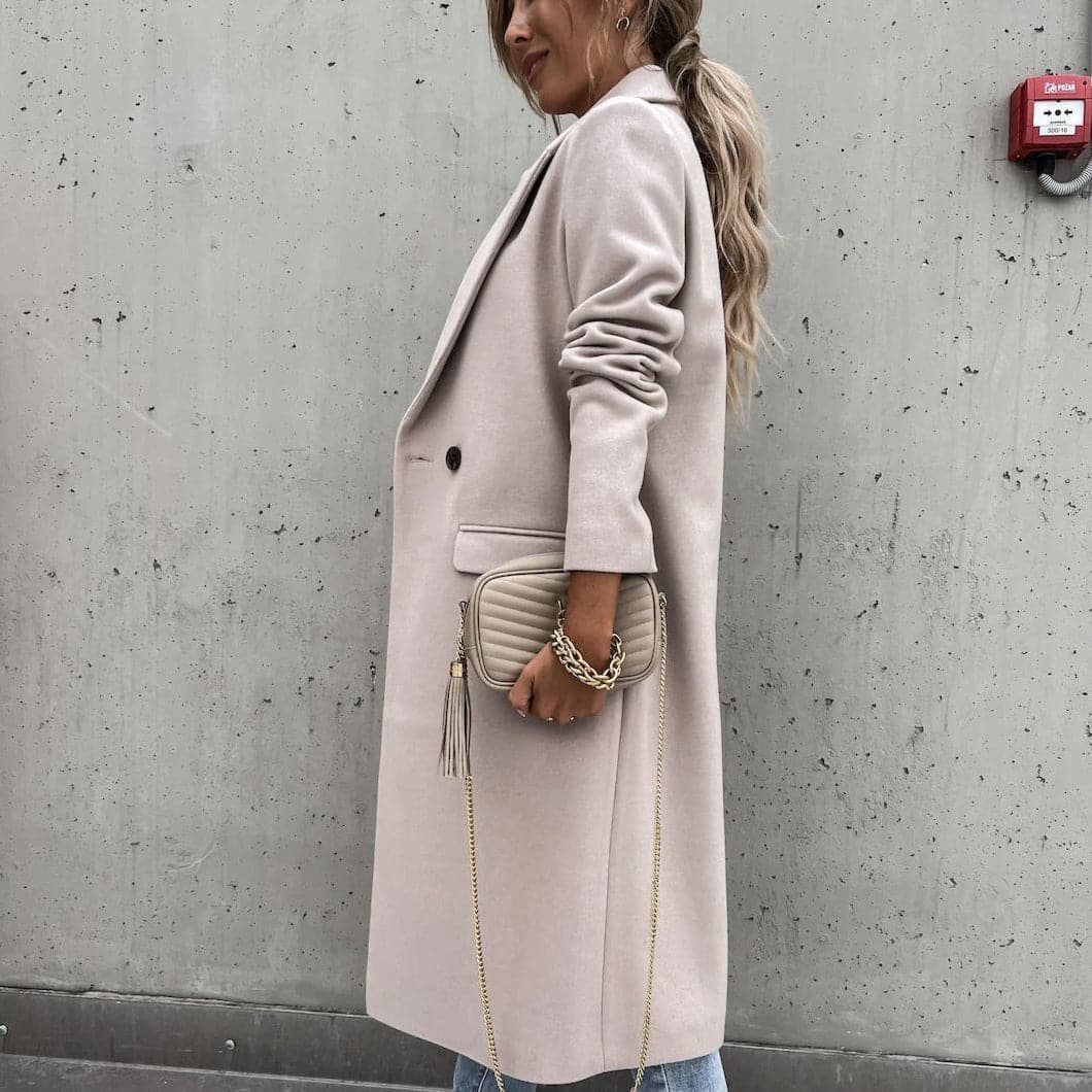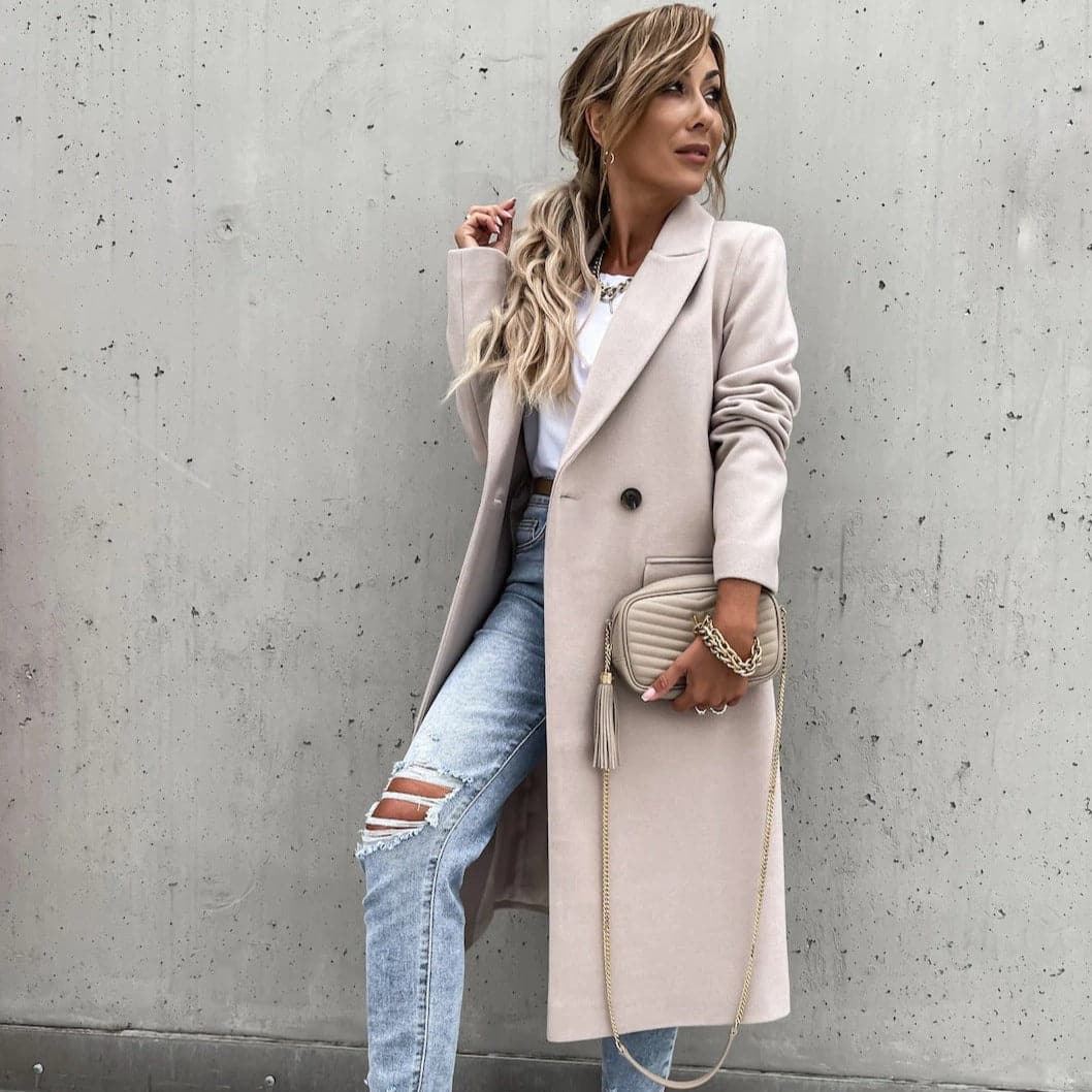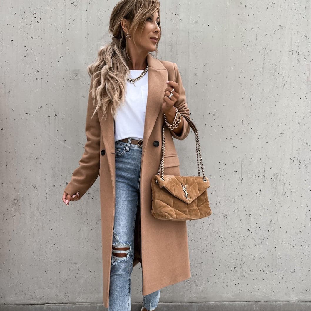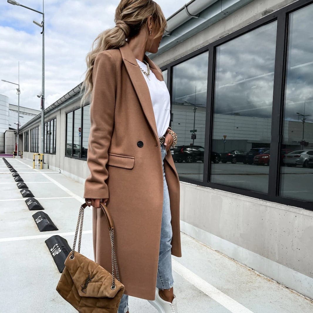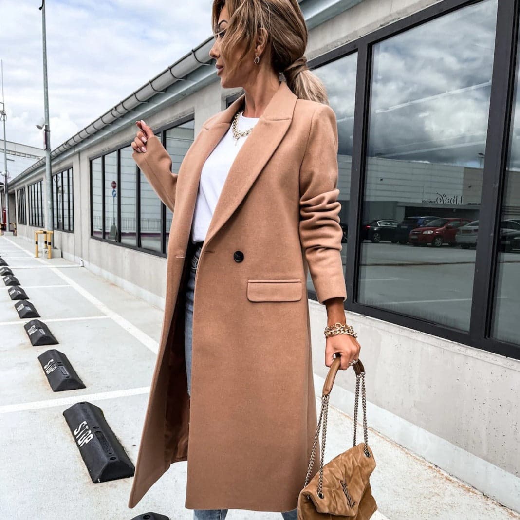 Erhöhen Sie Ihren urbanen Chic mit dem langen Mantel "Autumn Elegance". Sorgfältig entworfen mit einem Fokus auf Stil und Komfort, ist dieser wunderschöne Mantel in Kamel-Farbe das vielseitige Element Ihrer Garderobe, das Ihren Alltagslook auf ein ganz neues Niveau von Raffinesse hebt. Die gekerbten Revers und die doppelte Knopfleiste bieten zeitlose Eleganz, während die lässige Passform ein einfaches Überziehen über Ihre Lieblings-T-Shirts oder -Pullover gewährleistet.