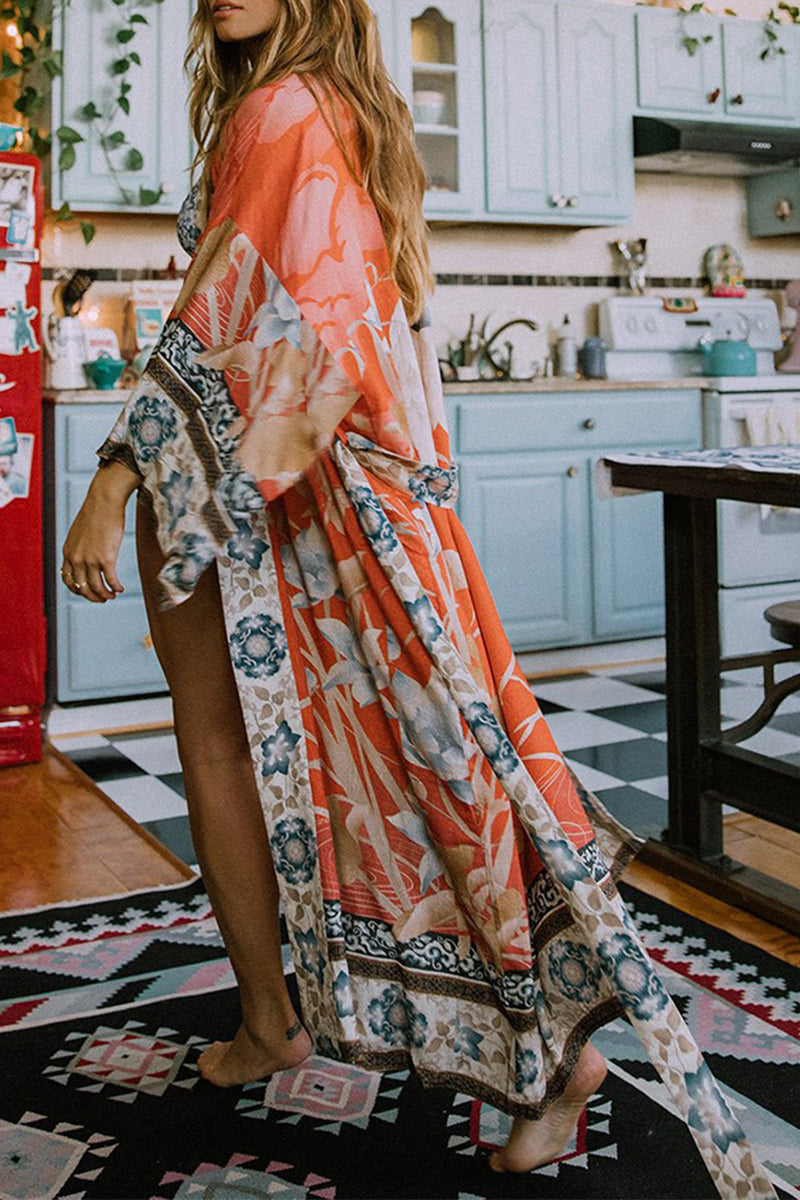 Damen Kimono – Fließender Schnitt – Atmungsaktiver Stoff – Blumenmuster – Bindegürtel