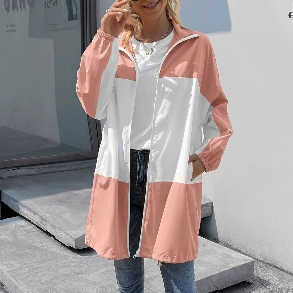 Damen Regenjacke – Lässiger Schnitt – Mittellang – Kapuze – Colorblock