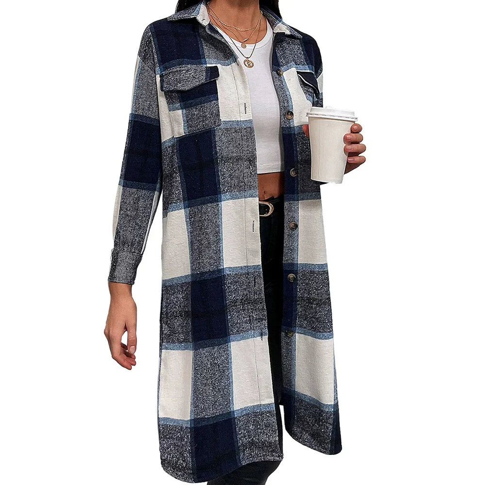 Damen Überwurfjacke – Oversize-Schnitt – Karomuster – Reverskragen – Mittellange