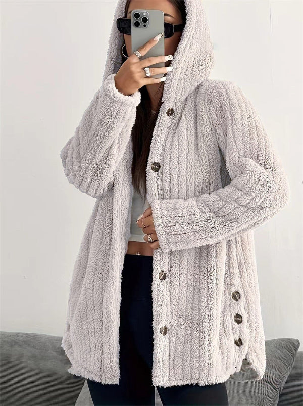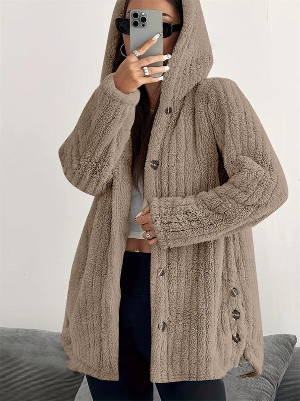 Damenmantel mit Kapuze – Weite Passform – Knopfverschluss – Weiches Plüschmaterial