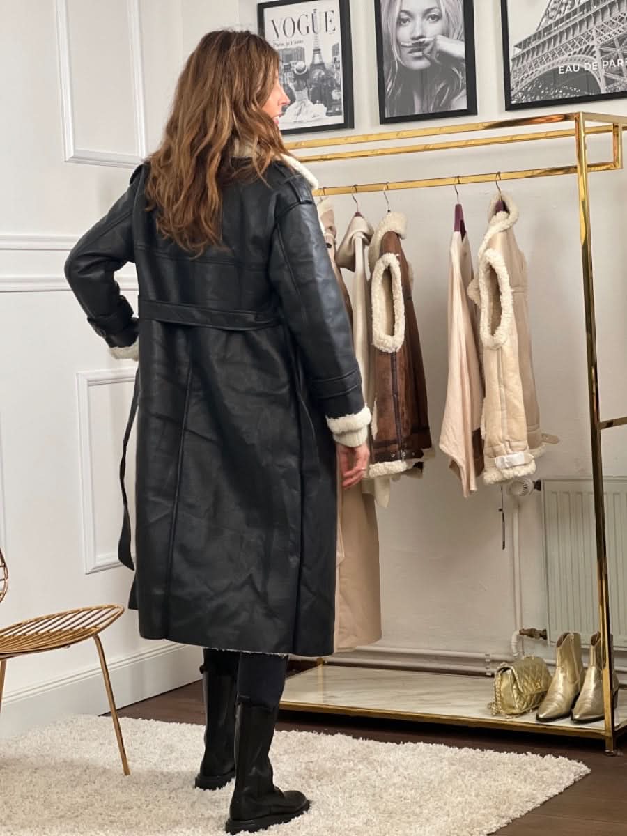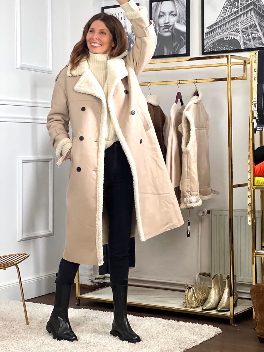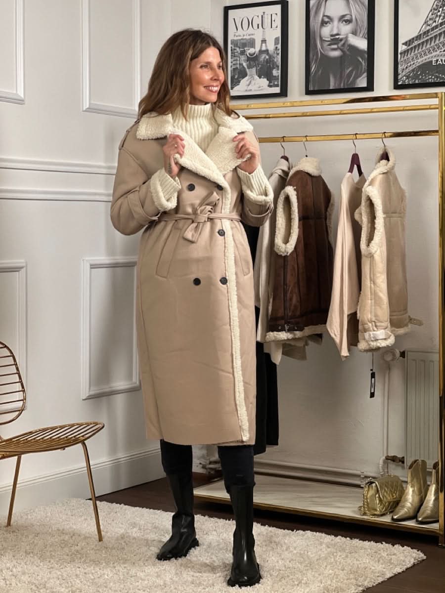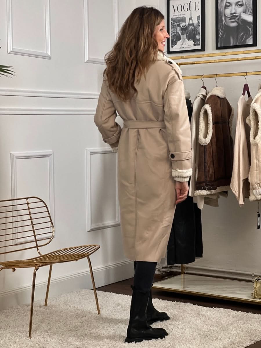 Das zeitlose Design der klassischen Trenchcoat-Silhouette wird durch eine doppelte Knopfleiste und einen Taillengürtel aufgewertet, der für alle Silhouetten schmeichelhaft ist und einen maßgeschneiderten Look bietet. Ausgestattet mit einem ultraweichen Kragen und Futter aus Schafsfell, sorgt dieser Mantel dafür, dass Sie an kalten Tagen warm bleiben, ohne auf Stil zu verzichten.