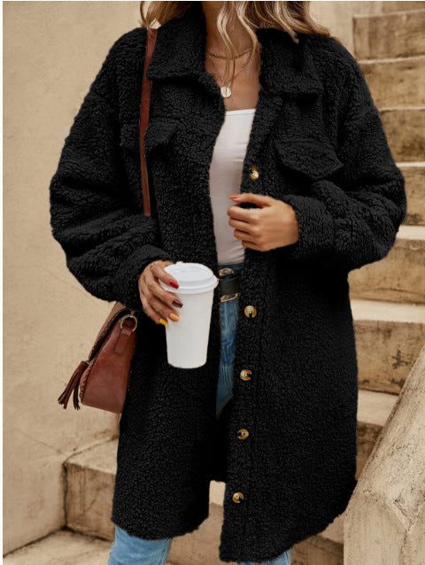 Langer Damenmantel – Oversize-Schnitt – Fausse Wolle mit Flausch – Klassische Knopfleiste
