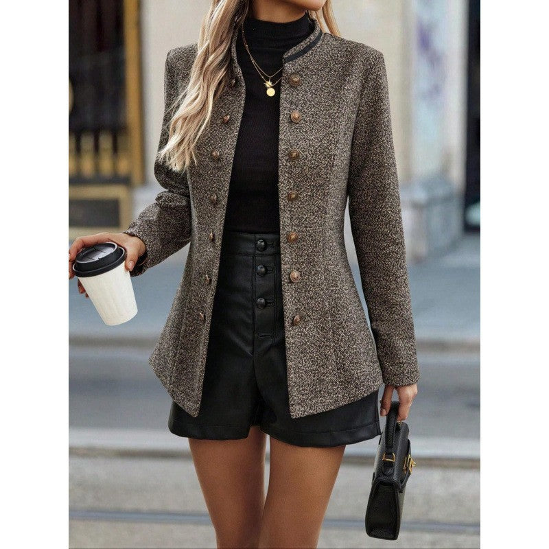 Langer Damenmantel – Taillierte Passform – Warmes, wollähnliches Material – Stehkragen – Doppelte Knopfleiste
